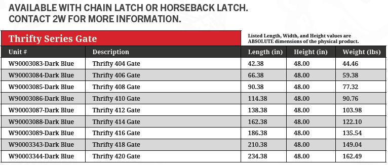 One of the most popular products manufactured by 2W, the Thrifty Series Medium Duty Swing Gate provides a trifecta solution to cattle handlers in terms of cost, quality, and availability. A perfect solution for driveway entry, heavy duty fence line entry, road sectioning, ranch gates, and much more.